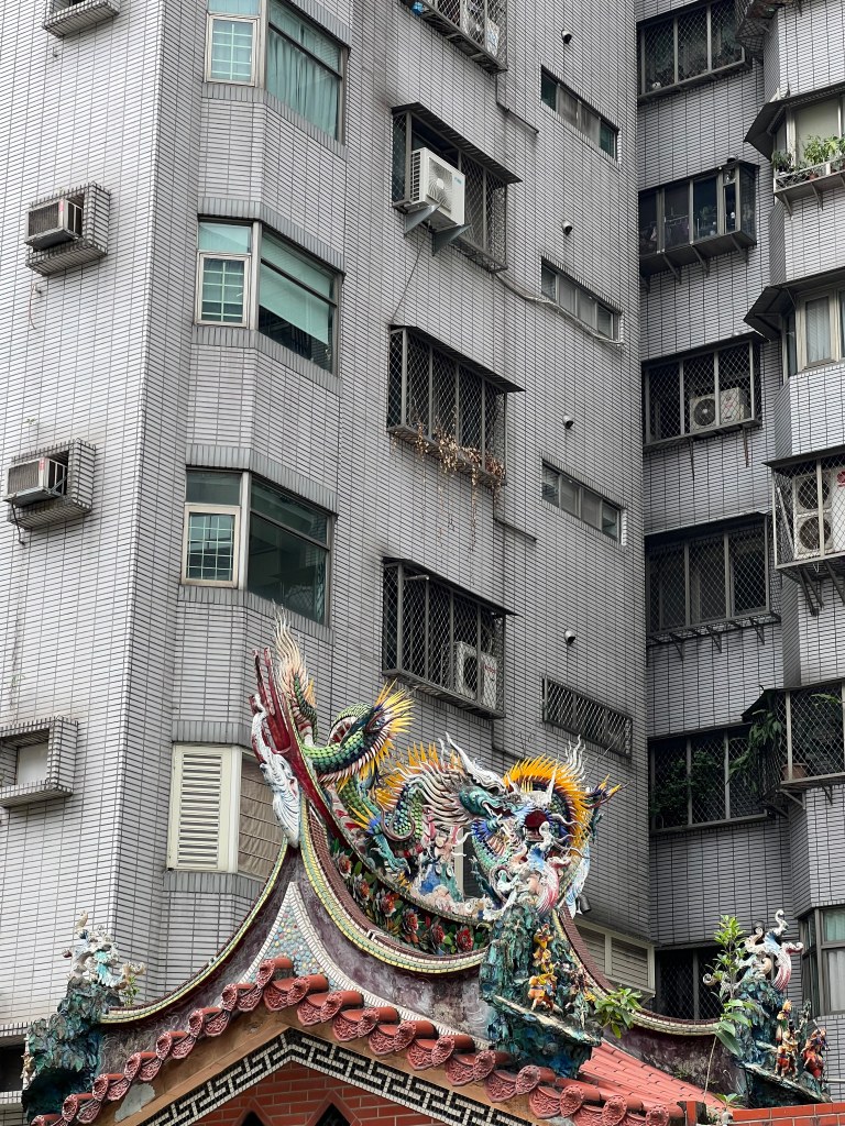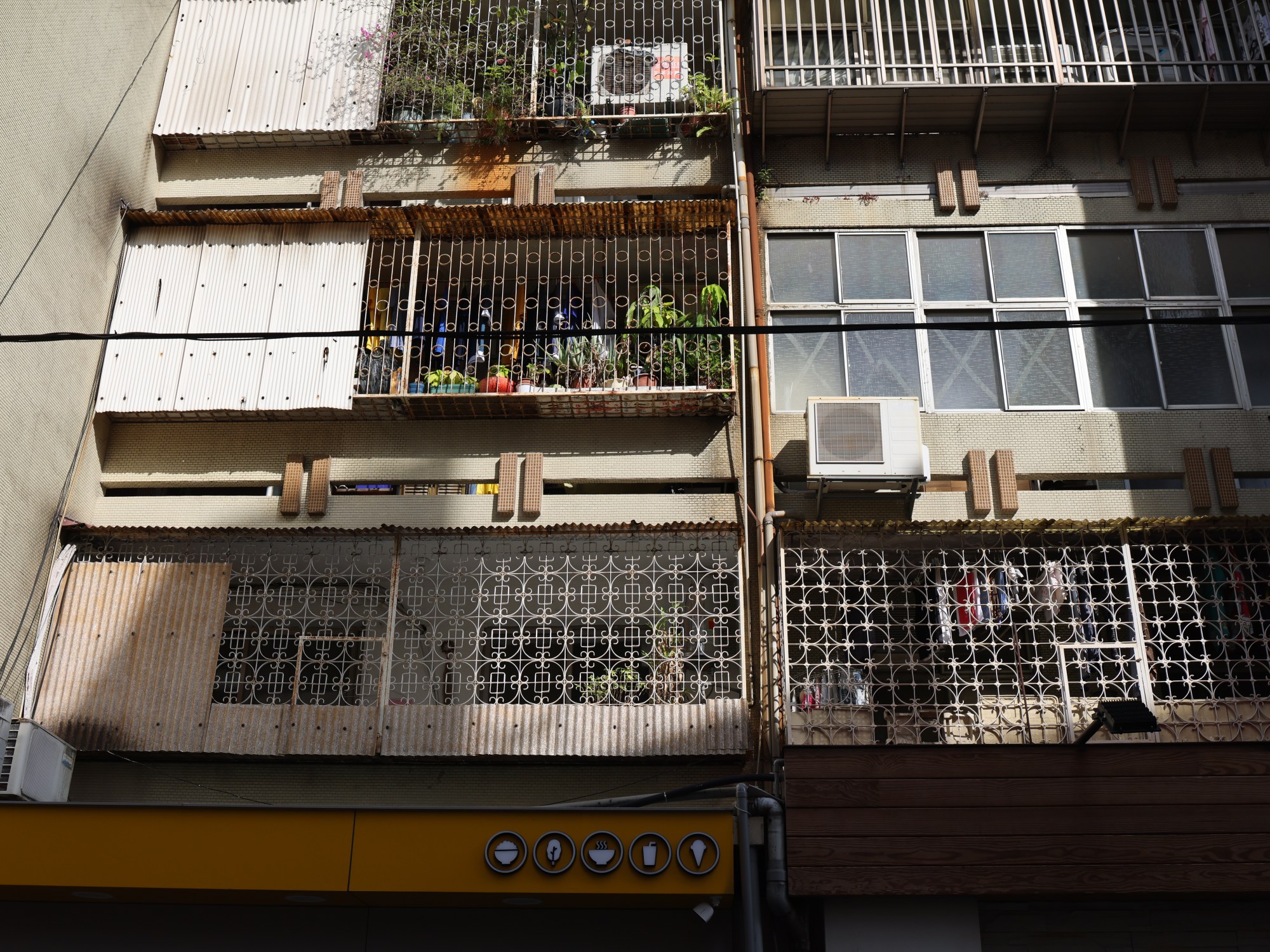 The morning sun hints at the lush balconies hidden behind grey and beige veiled buildings.