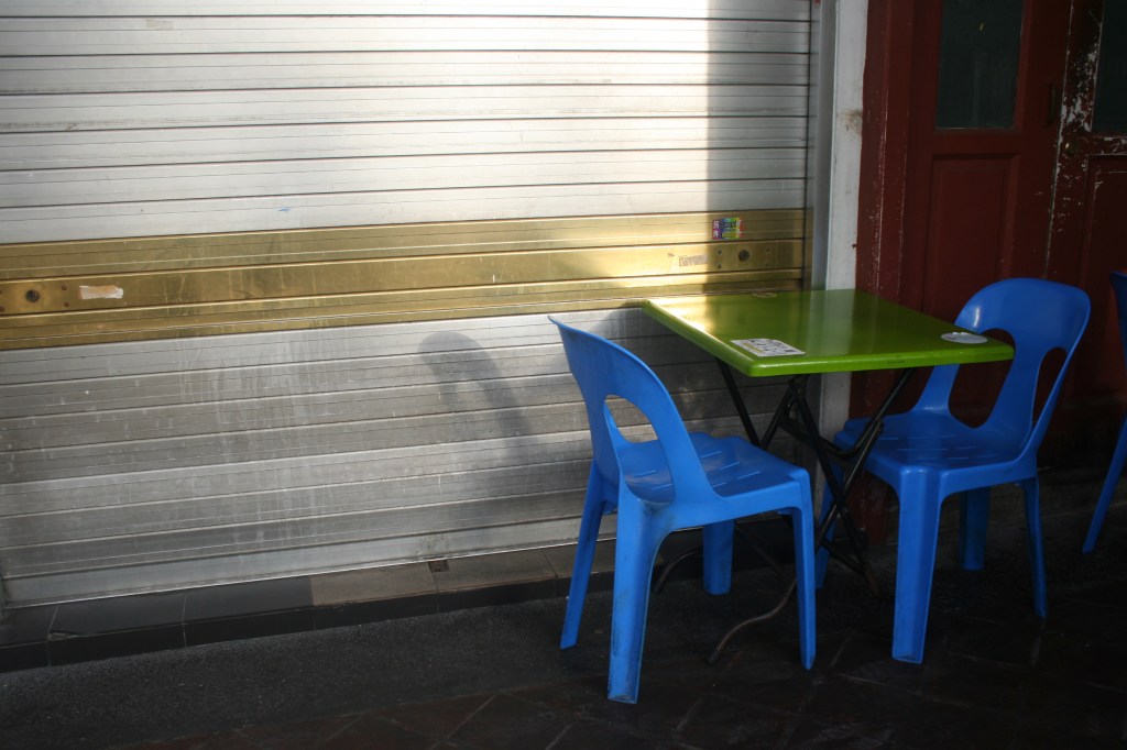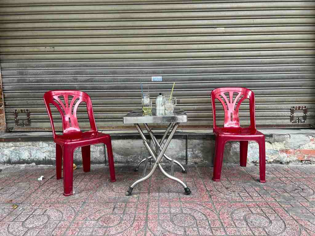 There are never enough places to sit in public spaces. Why? Casual conversation among strangers builds community. This ad hoc café is a remnant of a good conversation.